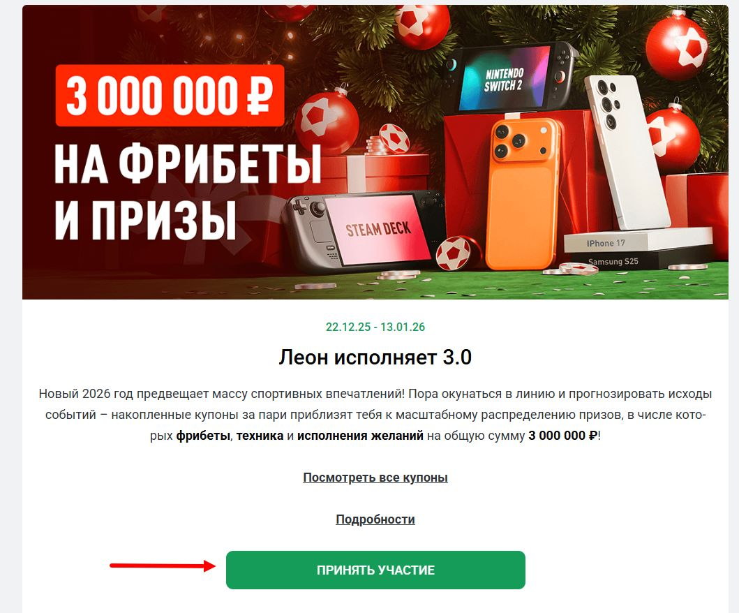 - Перейти на страницу акции «Леон исполняет 3.0» и нажать «Принять участие».