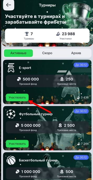 - Открыть раздел турниров в мобильном приложении компании.