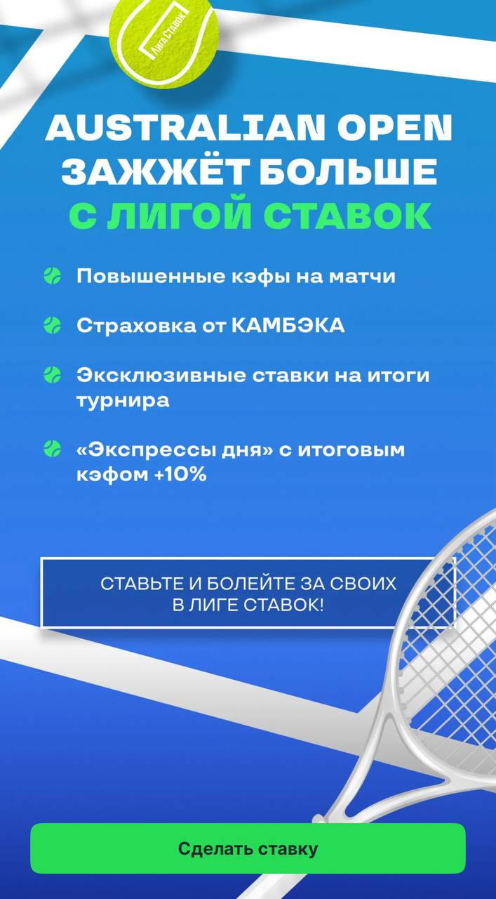 Букмекерская компания «Лига Ставок» проводит акцию к старту Australian Open, ориентированную на поклонников ставок на теннис. Предложение позволяет застраховать пари на победу фаворита в мужском одиночном разряде и получить фрибет в случае крайне неприятного сценария — поражения после преимущества 2:0 по сетам. Максимальный размер компенсации достигает 10 000 рублей.