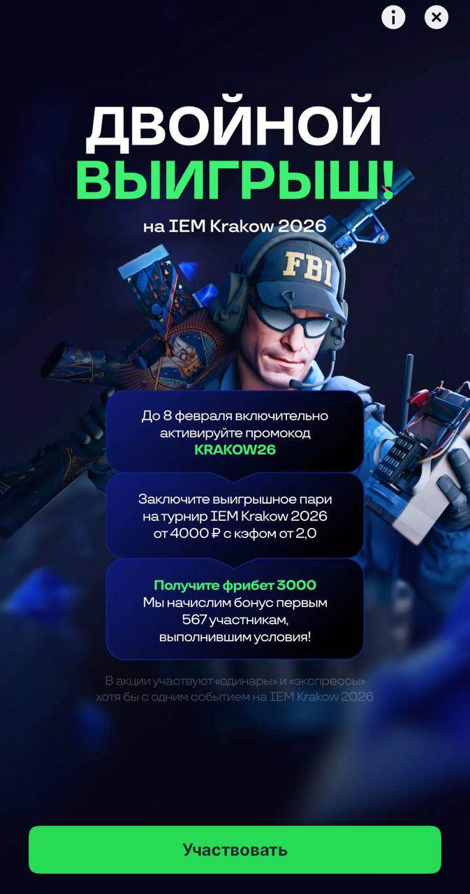 Пример участия. Игрок активирует промокод KRAKOW26 и оформляет ординар на матч IEM Krakow 2026 с коэффициентом 2.15 на сумму 4000 рублей. Если ставка выигрывает и входит в число первых 567 успешных пари, участнику начисляется фрибет 3000 рублей.