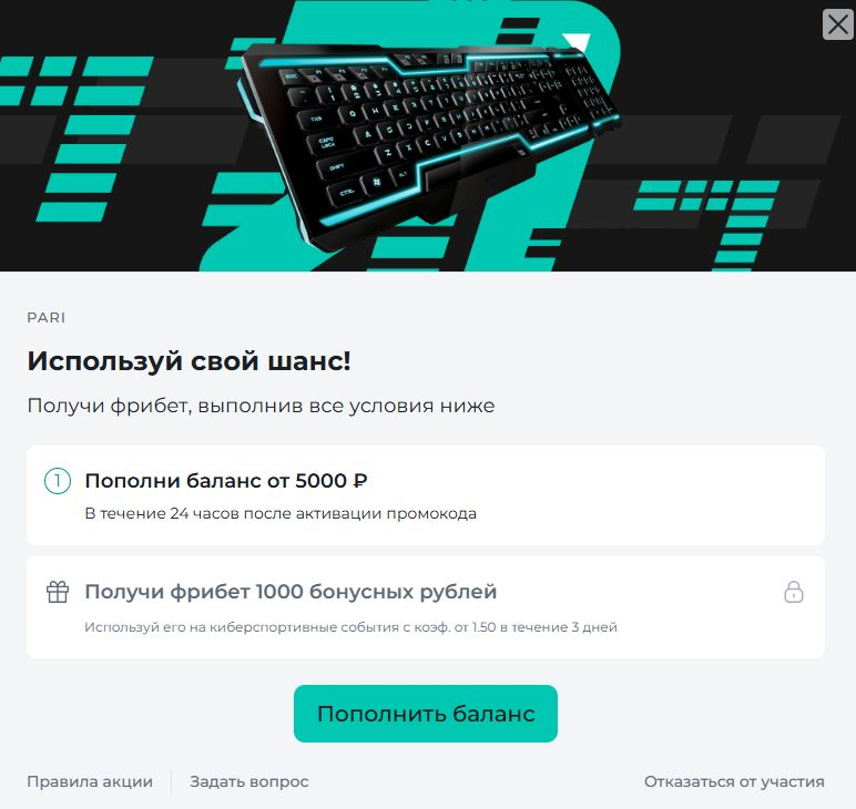 Пример. Игрок вводит промокод PARICS, после чего в течение суток пополняет баланс на 5000 рублей. После зачисления депозита букмекер начисляет фрибет 1000 рублей, который можно использовать для ставок на киберспортивные события.