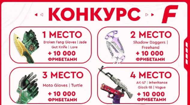 - 1 место — Broken Fang Gloves | Jade, Gut Knife | Lore и фрибеты на 10 000 рублей