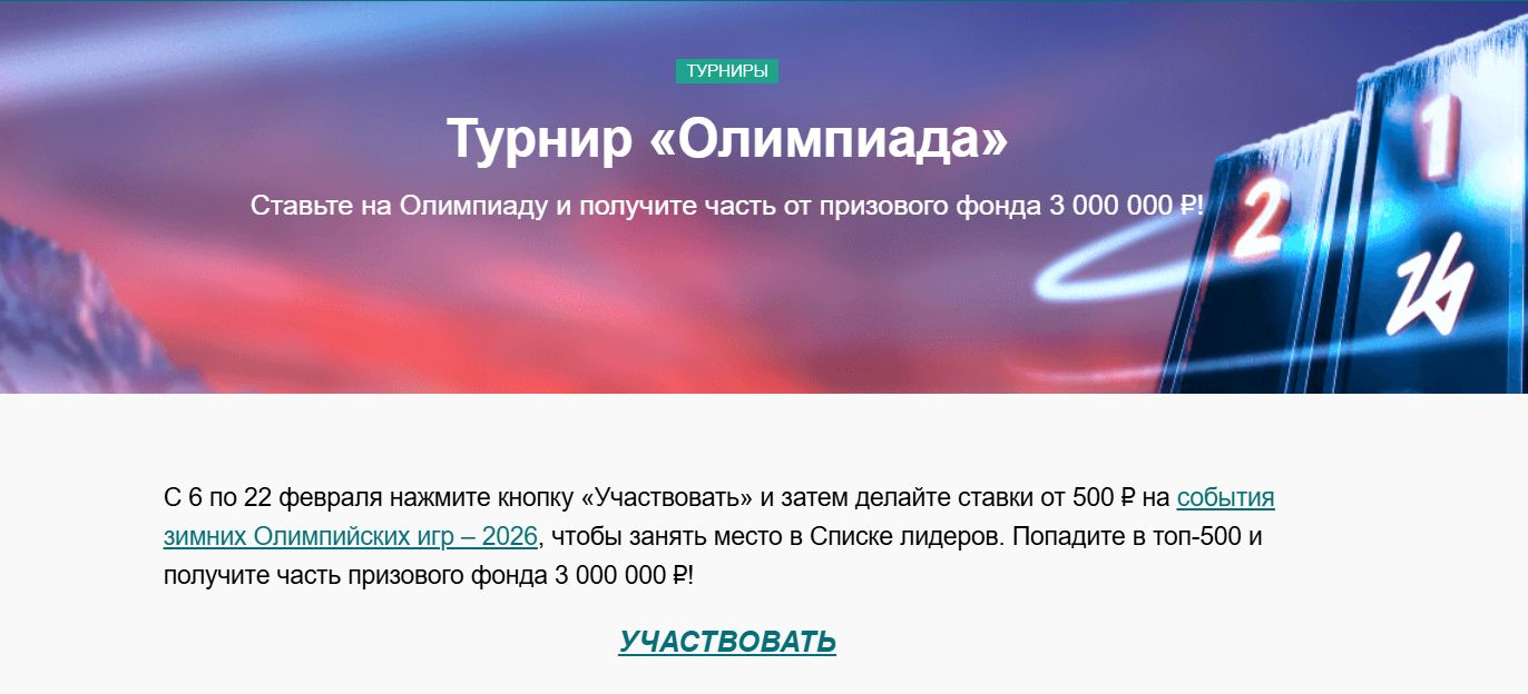 Букмекерская компания «Марафон» проводит турнир, приуроченный к старту зимних Олимпийских игр. Акция ориентирована на активных игроков: чем больше ставок на олимпийские события, тем выше позиция в таблице. Общий призовой фонд турнира составляет 3 000 000 рублей, а 500 лучших участников получат фрибеты номиналом от 500 до 300 000 рублей.