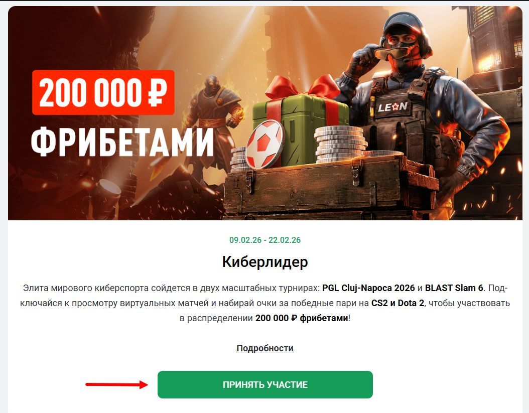 Букмекерская компания «Леон» проводит акцию «Киберлидер», приуроченную к крупнейшим турнирам по CS2 и Dota 2 — PGL Cluj-Napoca 2026 и BLAST Slam 6. Участники, заключающие успешные пари на киберспортивные события и набирающие очки в турнирной таблице, смогут войти в число лучших игроков и разделить призовой фонд 200 000 рублей фрибетами.
