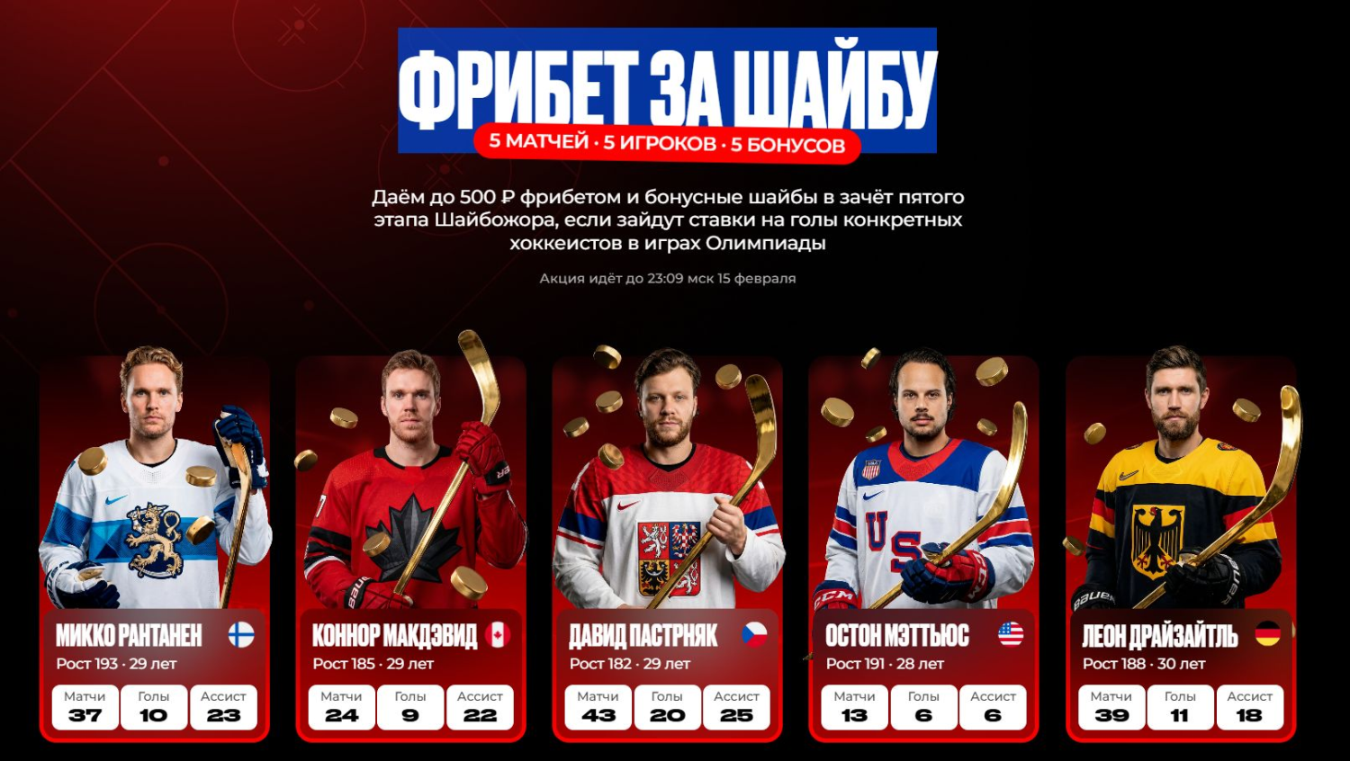 В рамках хоккейного турнира Олимпийских игр компания «Олимпбет» проводит акцию «Фрибет за шайбы». Клиентам предлагается прогнозировать голы конкретных хоккеистов в топовых матчах сборных. За успешные ставки участники получают фрибеты по 100 рублей, а также дополнительные «шайбы» для продвижения в рейтинге акции «Шайбожор». Предложение действует ограниченное время и распространяется на заранее определенные встречи с участием ведущих игроков мирового хоккея.
