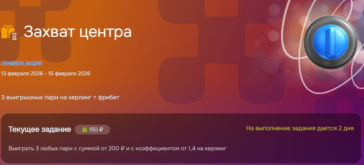Букмекерская контора «Балтбет» проводит акцию «Захват центра» для любителей кёрлинга, предлагая фрибет за 3 выигранных ставки.