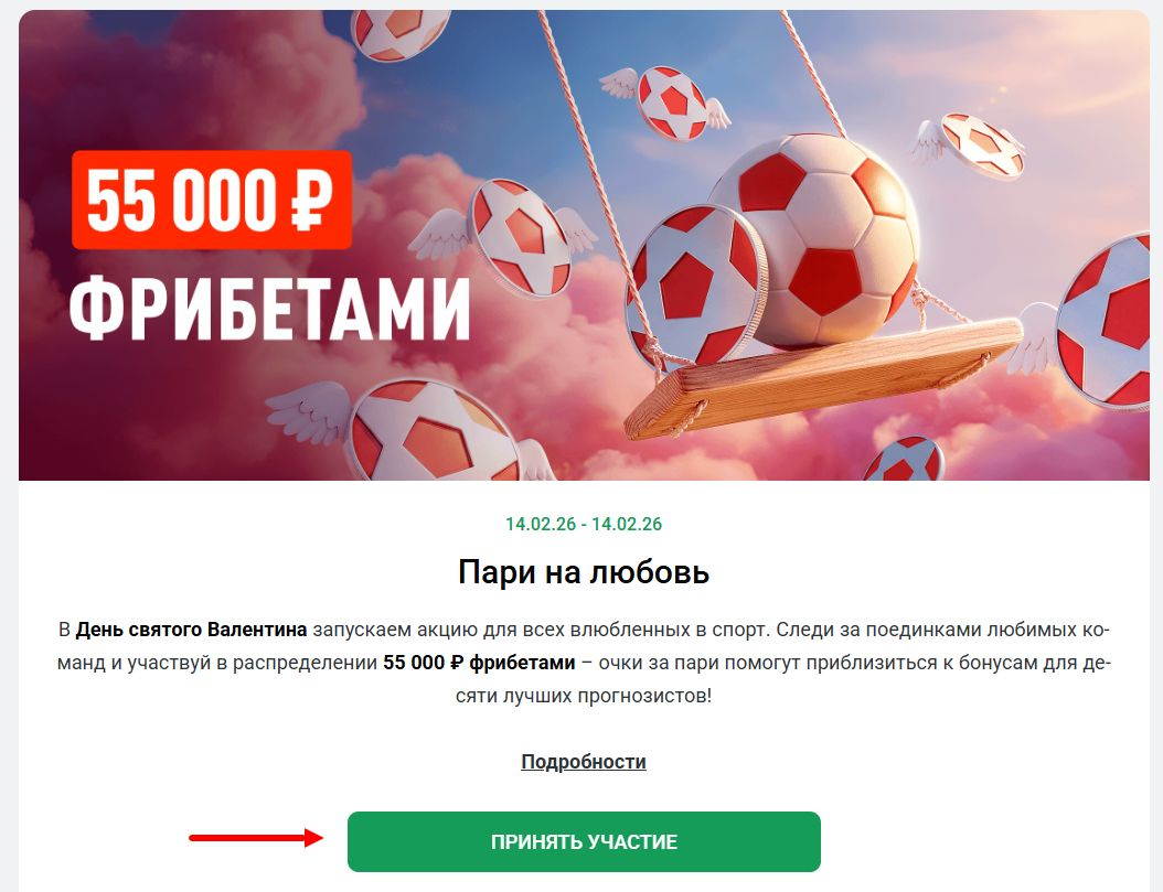 В День святого Валентина букмекерская компания «Леон» проводит акцию «Пари на любовь». Участникам предлагается признаться в любви спорту через активные ставки и побороться за часть призового фонда 55 000 рублей. По итогам акции 10 клиентов, набравших наибольшее количество баллов за 14 февраля, получат фрибеты номиналом от 1000 до 10 000 рублей.