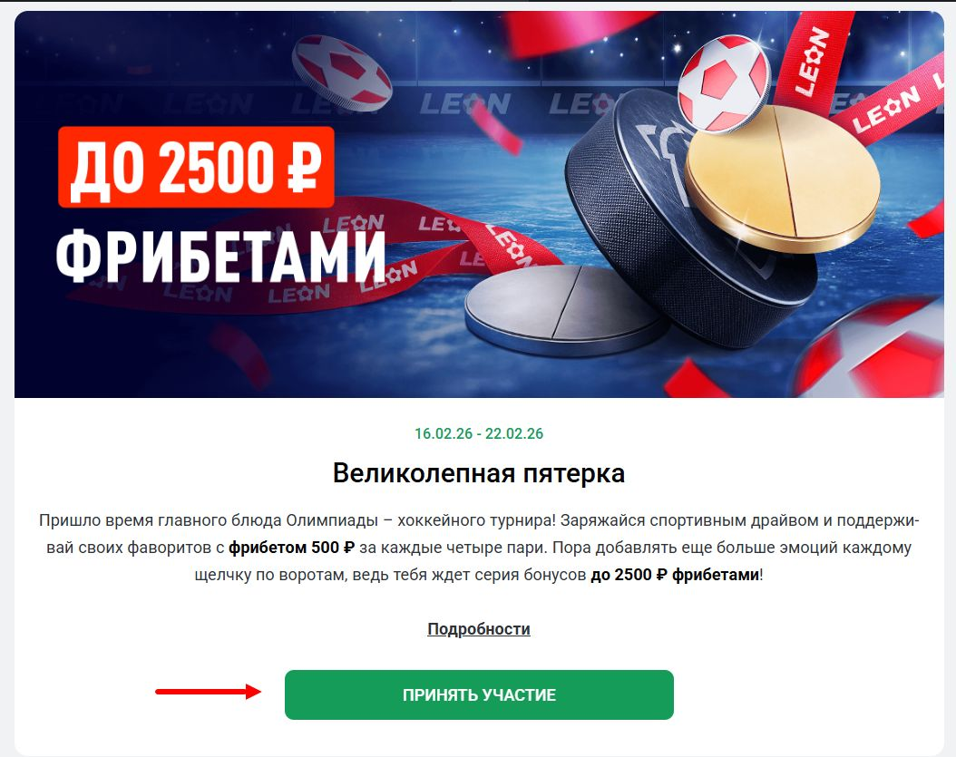 Акция «Великолепная пятерка» в БК «Леон» приурочена к хоккейному турниру Олимпийских игр и позволяет получить до пяти фрибетов по 500 рублей каждый.