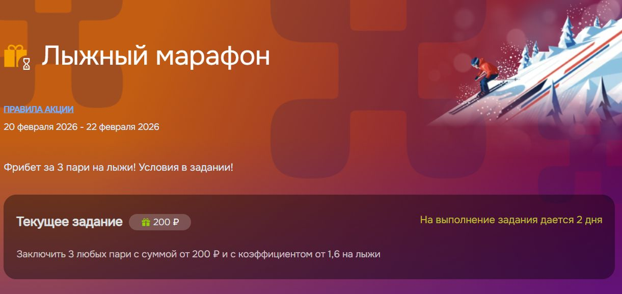 - Заключить 3 ставки (с указанными условиями) на любые лыжные события до конца акции с указанными в задании коэффициентами и суммами.