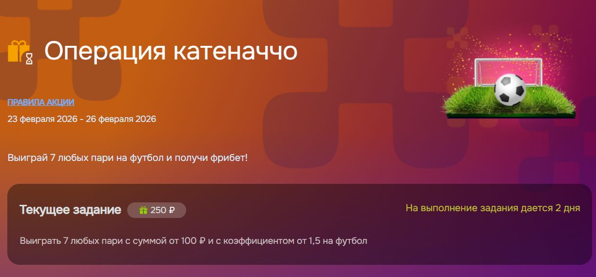 Букмекерская контора «Балтбет» проводит акцию «Операция катеначчо» для ставок на футбол. Участнику нужно выполнить персональное задание и получить фрибет. Задание и размер бонуса система определяет индивидуально.