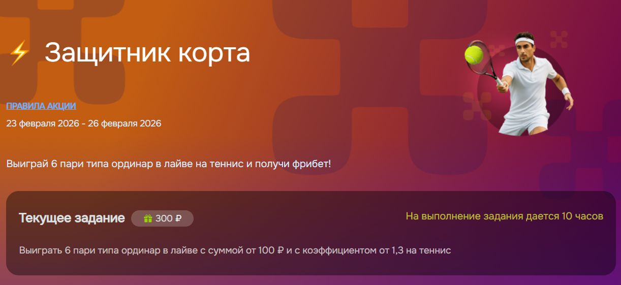 - В течение 10 часов после активации выполнить персональное задание – выиграть шесть одиночных live-ставки на теннис согласно указанным условиям.