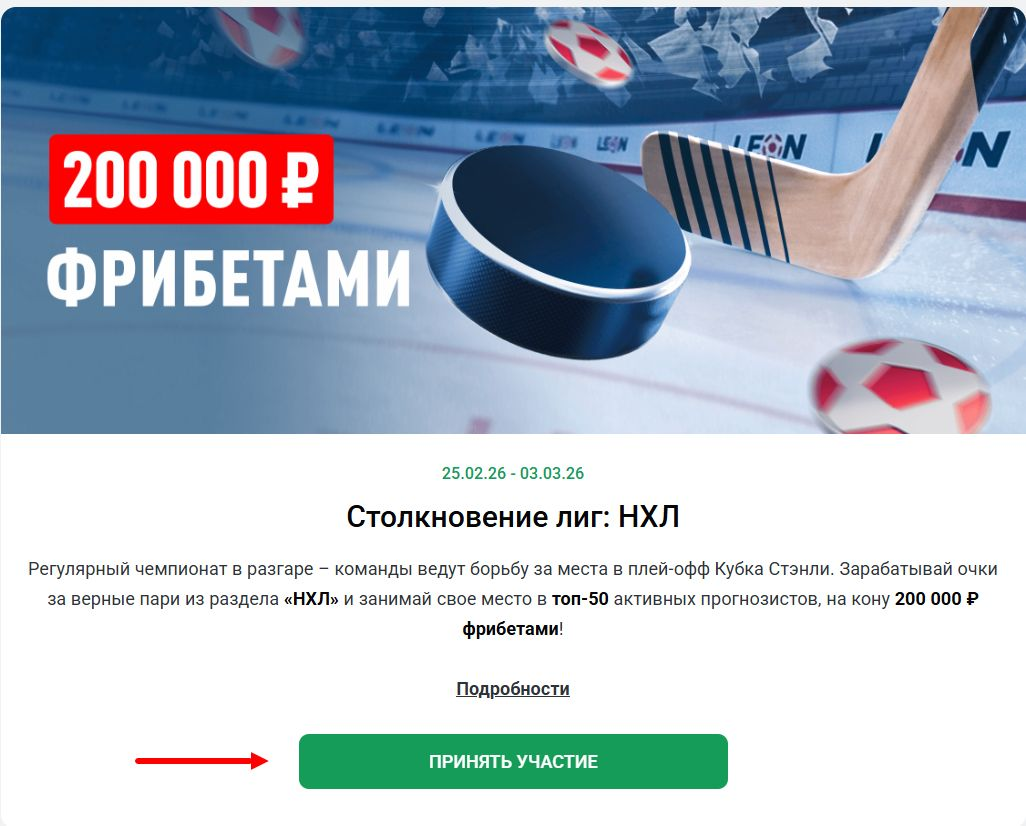 Букмекерская контора «Леон» проводит турнирную акцию для любителей хоккея, в рамках которой пользователи могут получать очки за выигрышные ставки на матчи Национальной хоккейной лиги и претендовать на фрибеты до 30000 рублей. Предложение доступно всем клиентам и дополнительно учитывается в акции «Столкновение лиг».