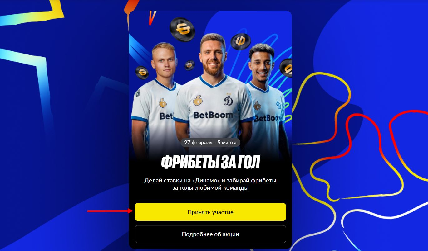 - На странице акции «Фрибеты за гол», которую можно найти в разделе бонусов, нажать «Принять участие».