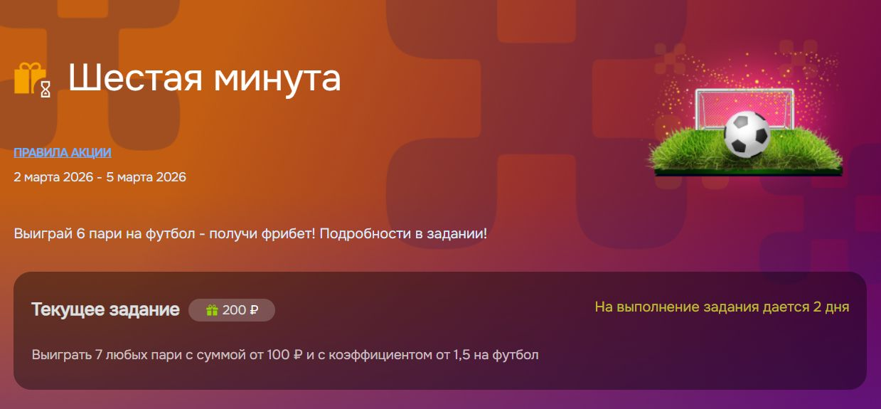 Букмекерская контора «Балтбет» проводит акцию «Шестая минута» для ставок на футбол. Участнику нужно выполнить персональное задание и получить фрибет. Задание и размер бонуса система определяет индивидуально.