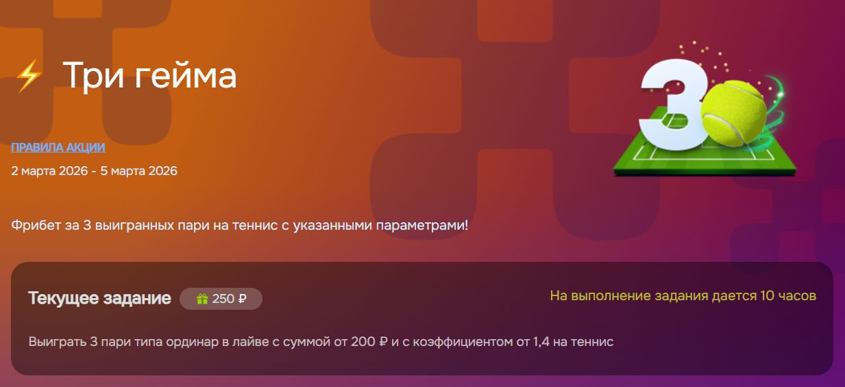 - В течение 10 часов после активации выполнить персональное задание – выиграть три одиночных live-ставки на теннис согласно указанным условиям.