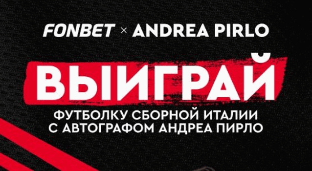 Букмекерская компания «Фонбет» проводит специальную акцию для поклонников итальянского футбола. Участникам предлагают сделать ставку на матч чемпионата Италии и получить шанс выиграть эксклюзивный приз — футболку национальной команды с автографом легендарного полузащитника Андреа Пирло.