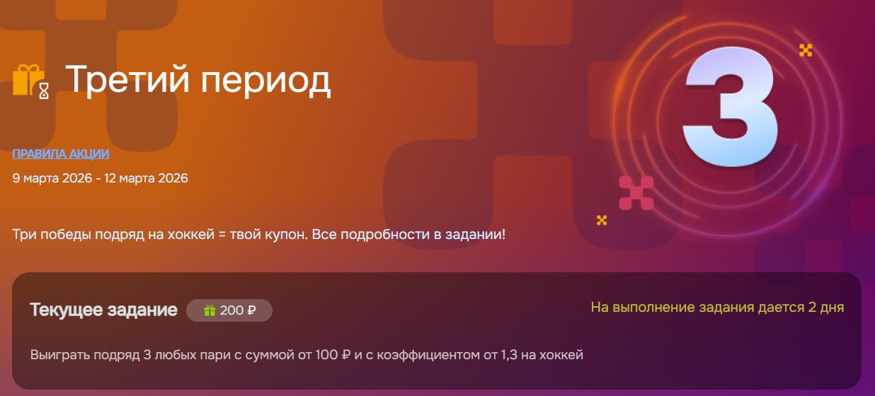 - Выиграть 3 ставки подряд (с указанными условиями) на любые хоккейные события с указанными в задании коэффициентами и суммами.