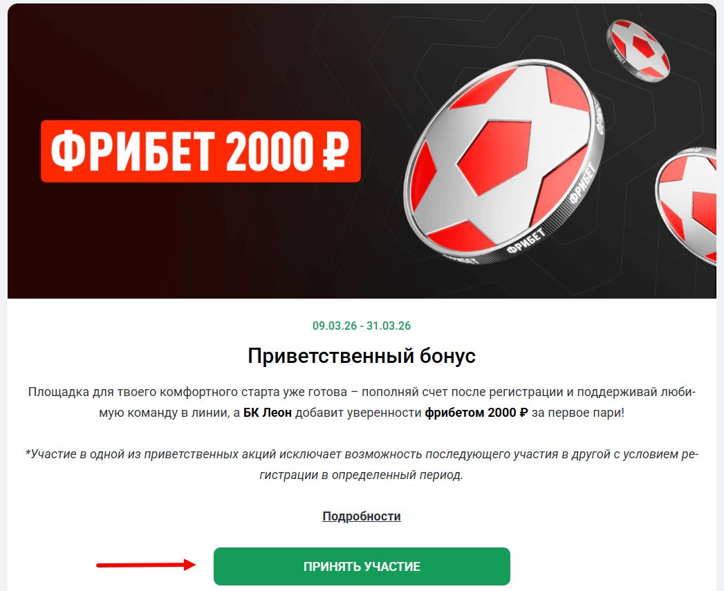 Букмекерская компания «Леон» проводит приветственную акцию для новых клиентов. Пользователи, которые зарегистрируются в период действия предложения, могут получить фрибет 2000 рублей за первое пари.