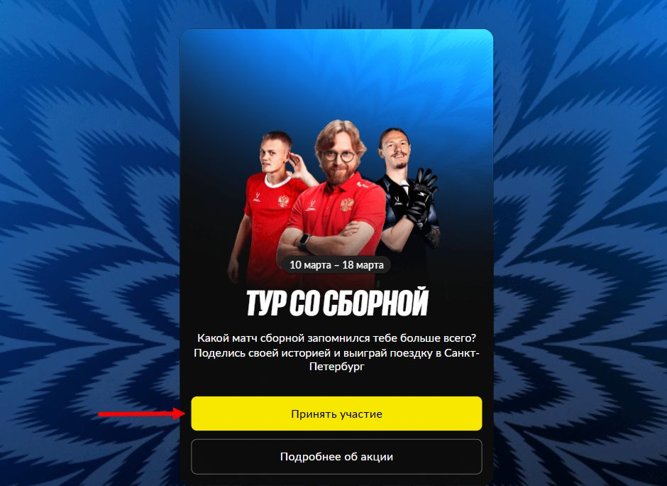 - На странице акции «BetBoom тур со сборной», которую можно найти в разделе бонусов, нажать «Принять участие».