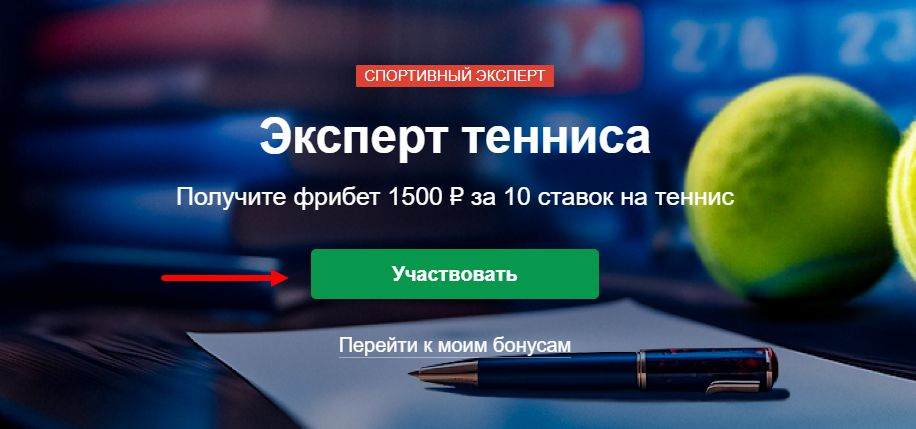 - Перейти на страницу акции «Эксперт тенниса» (можно найти в разделе акций) и нажать кнопку «Участвовать»;