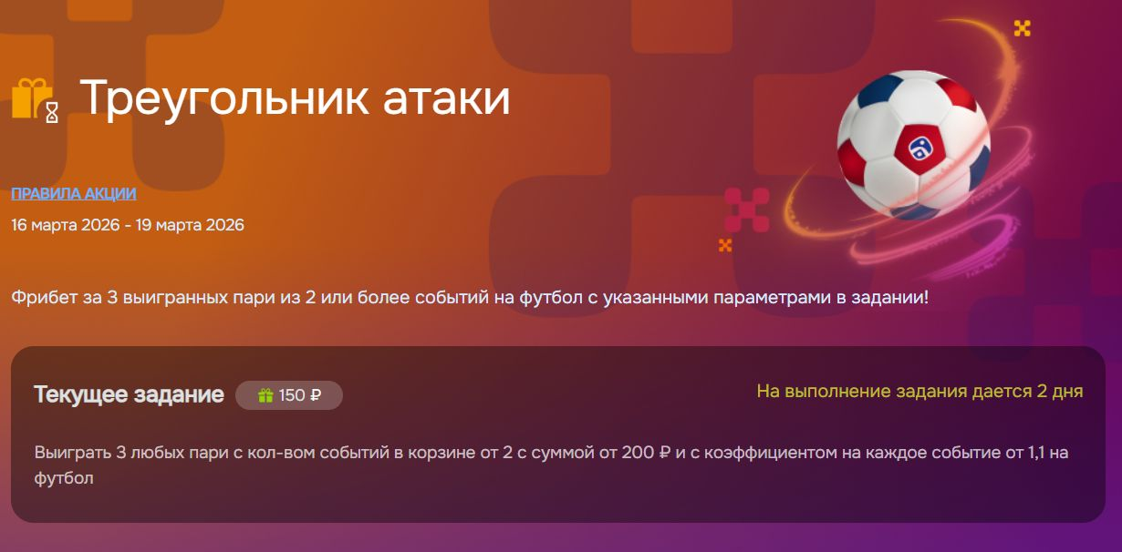 - Выиграть три экспресса на футбол с количеством событием от двух в течение двух дней с момента участия (или до конца акции) с указанными в задании коэффициентами и суммами.