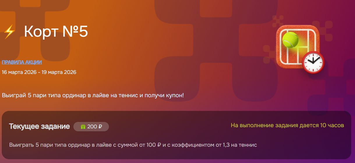 - В течение 10 часов после активации выполнить персональное задание – выиграть пять одиночных live-ставок на теннис согласно указанным условиям.