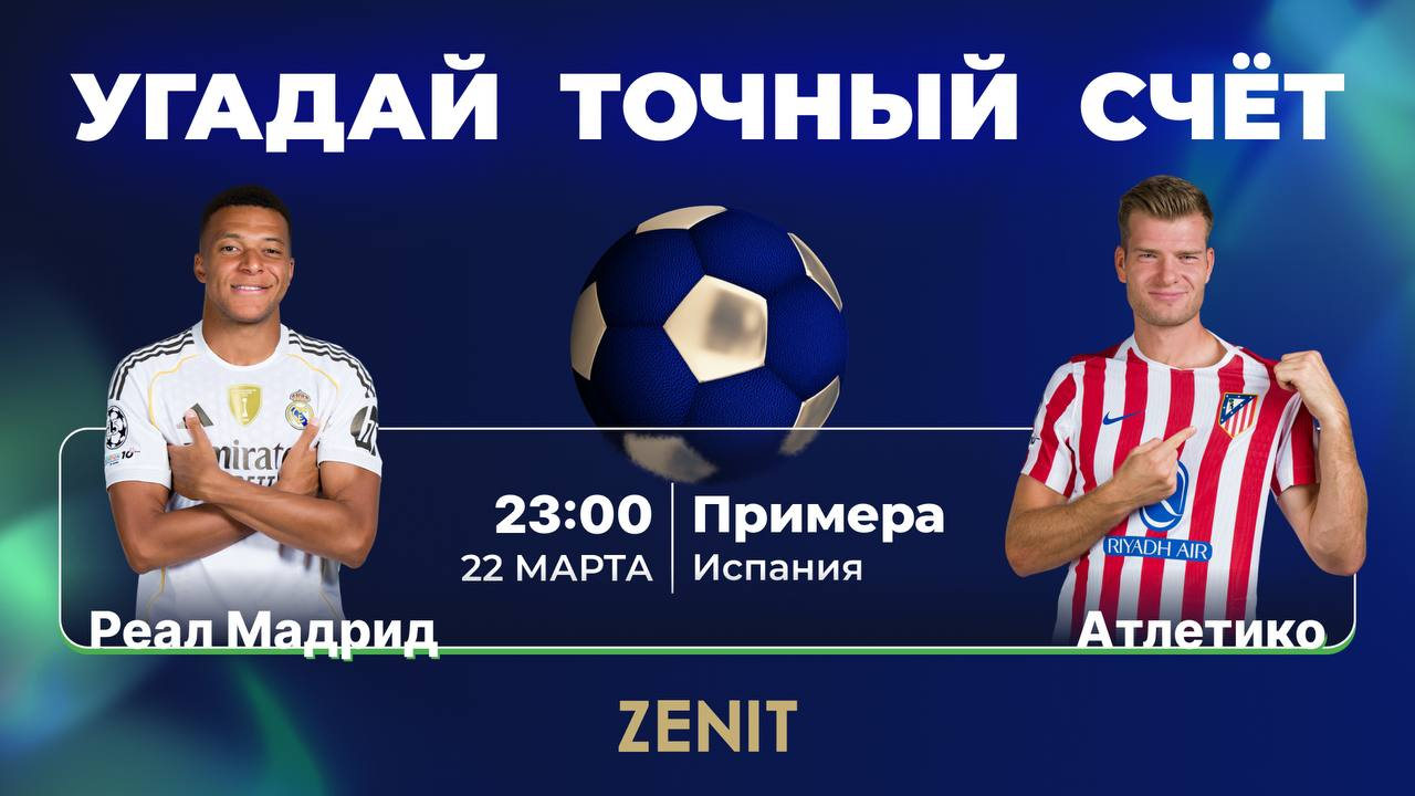 В преддверии матча Ла Лиги «Реал» — «Атлетико» (начало матча 22 марта, 23:00 мск) букмекерская компания «Зенит» приглашает всех клиентов угадать точный счёт матча и выиграть 250 Зенов (их можно обменять на фрибеты). Делайте прогноз и участвуйте в розыгрыше без ограничений по числу победителей!