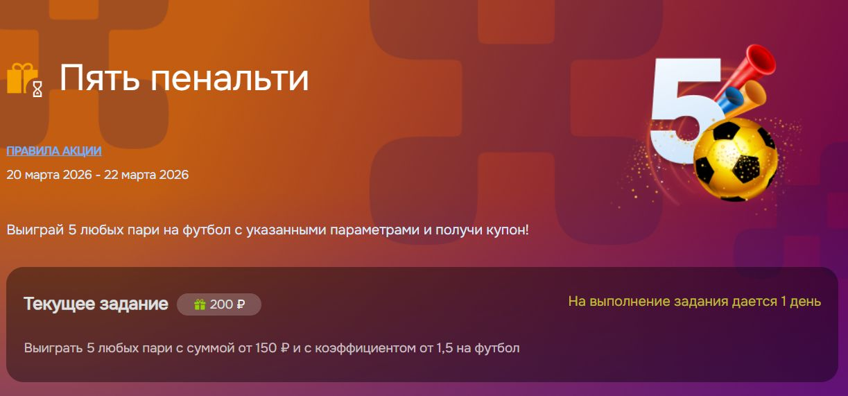 Букмекерская контора «Балтбет» проводит акцию «Пять пенальти» для ставок на футбол. Участнику нужно выполнить персональное задание и получить фрибет. Задание и размер бонуса система определяет индивидуально.