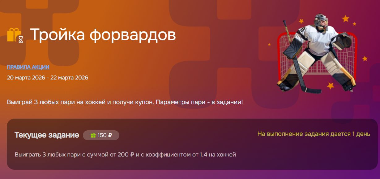 Букмекерская контора «Балтбет» проводит акцию «Тройка форвардов» для любителей хоккея, предлагая фрибет за три выигранных ставки.