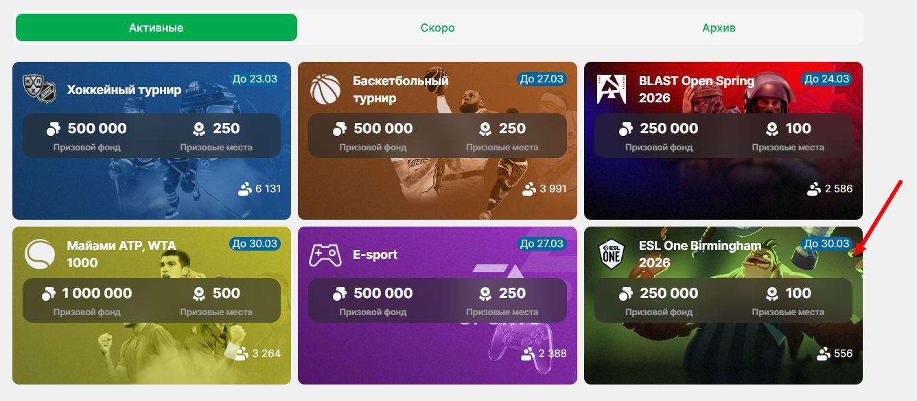 - С основного счёта заключать пари на события из раздела «ESL One Birmingham 2026» в период проведения турнира с коэффициентом от 1.25 и суммой от 100 рублей. Экспресс должен включать минимум одно событие из раздела «ESL One Birmingham 2026» с коэффициентом от 1.25.