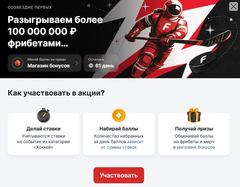 Механика акции построена по принципу накопления: чем выше ежедневный оборот ставок на хоккей, тем больше баллов начисляется на бонусный счет. Полученные баллы можно использовать в «Магазине бонусов» в любое время до завершения акции.