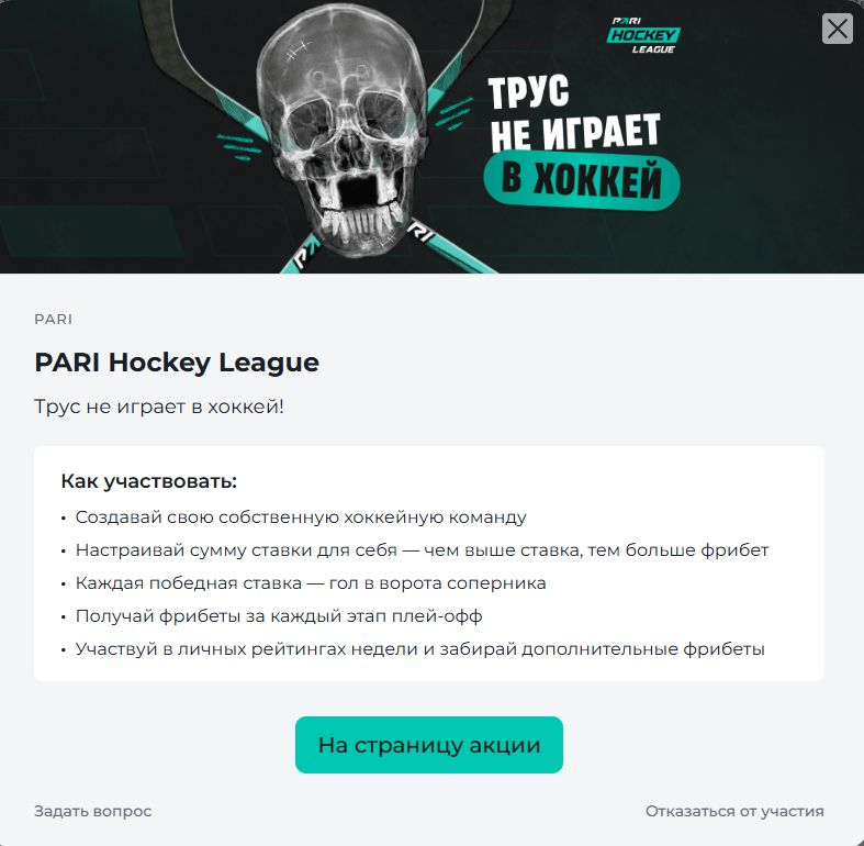 Акция «PARI Hockey League» от БК PARI представляет собой игровую механику, стилизованную под хоккейный плей-офф. Участникам предлагается собрать собственную команду, проходить стадии турнира за счёт ставок на хоккей и получать фрибеты за каждую успешную серию. Общий призовой фонд составляет 15 000 000 рублей, а итоговые бонусы зависят от выбранного уровня сложности и результатов игрока.