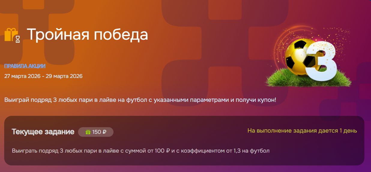 - Выполнить персональное задание: выиграть три лайв-ставки подряд на футбол на указанных условиях.
