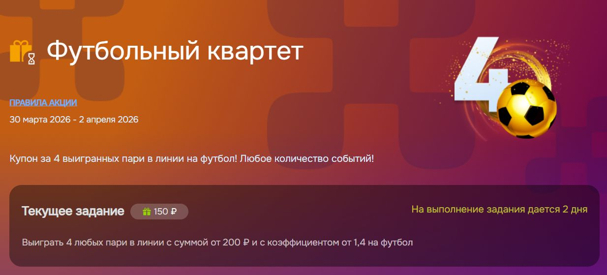 Букмекерская контора «Балтбет» проводит акцию «Футбольный квартет» для ставок на футбол. Участнику нужно выполнить персональное задание и получить фрибет. Задание и размер бонуса система определяет индивидуально.