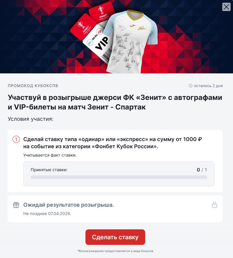 - Ввести промокод KUBOKSPB в разделе «Бонусы и акции».
