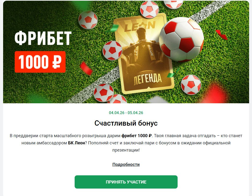 БК «Леон» проводит краткосрочную акцию с гарантированным бонусом для всех клиентов. В отличие от розыгрышей и конкурсов, здесь не требуется рассчитывать на удачу или попадать в число победителей — фрибет начисляется каждому участнику, выполнившему простое условие по депозиту.