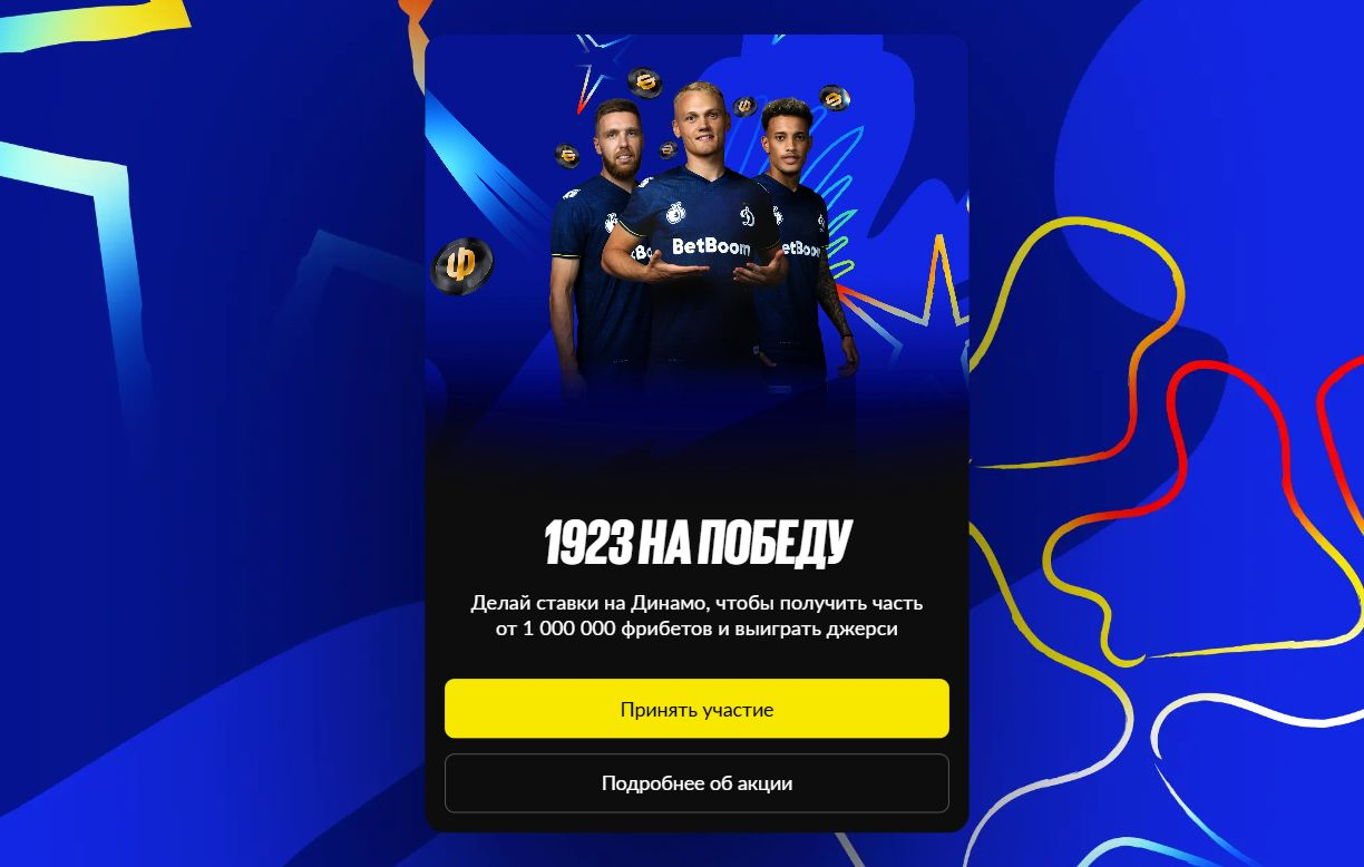 BetBoom проводит акцию для болельщиков московского «Динамо», в рамках которой каждый участник получает гарантированный фрибет за ставку на матчи команды. В отличие от классических розыгрышей, здесь не нужно рассчитывать на удачу — бонус начисляется всем, кто выполнит условия. Дополнительно предусмотрен розыгрыш фирменных джерси клуба среди участников.