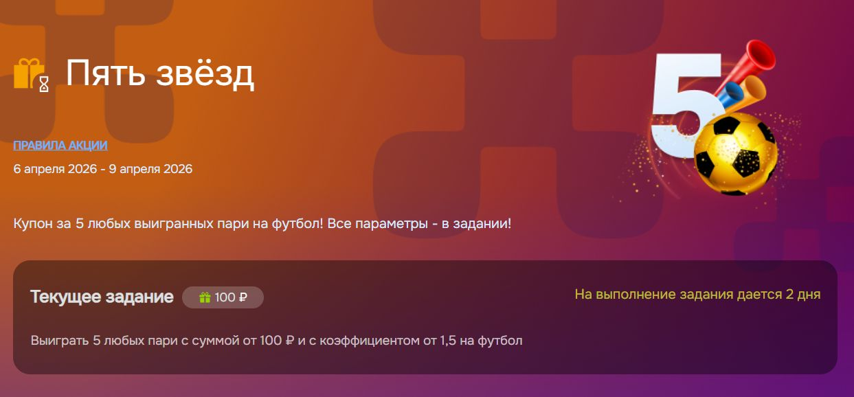 Букмекерская контора «Балтбет» проводит акцию «Пять звёзд» для ставок на футбол. Участнику нужно выполнить персональное задание и получить фрибет. Задание и размер бонуса система определяет индивидуально.