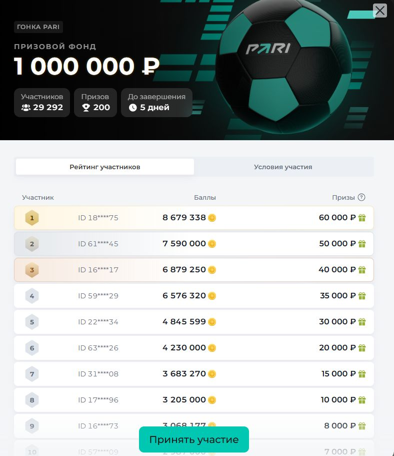 БК PARI проводит турнир «Гонка PARI» с призовым фондом 1 000 000 рублей. В рамках акции пользователи соревнуются между собой, набирая очки за ставки на футбольные матчи. По итогам турнира 200 лучших участников получат фрибеты номиналом от 3000 до 60 000 рублей.