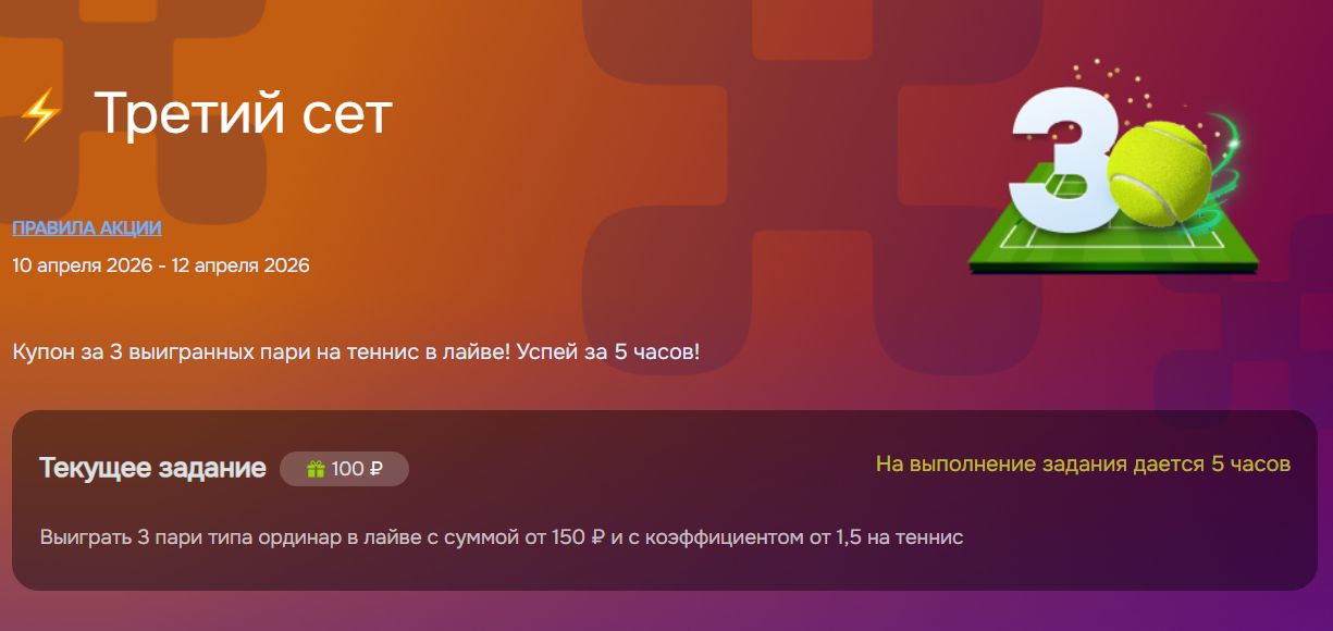 - В течение 5 часов после активации выполнить персональное задание – выиграть три одиночных live-ставки на теннис согласно указанным условиям.