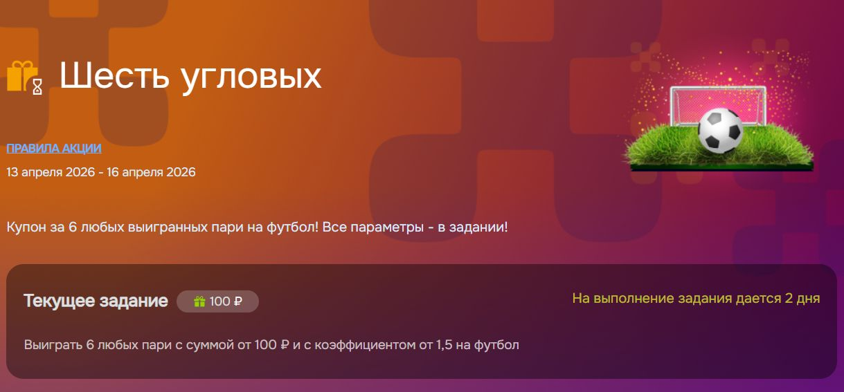 Букмекерская контора «Балтбет» проводит акцию «Шесть угловых» для ставок на футбол. Участнику нужно выполнить персональное задание и получить фрибет. Задание и размер бонуса система определяет индивидуально.