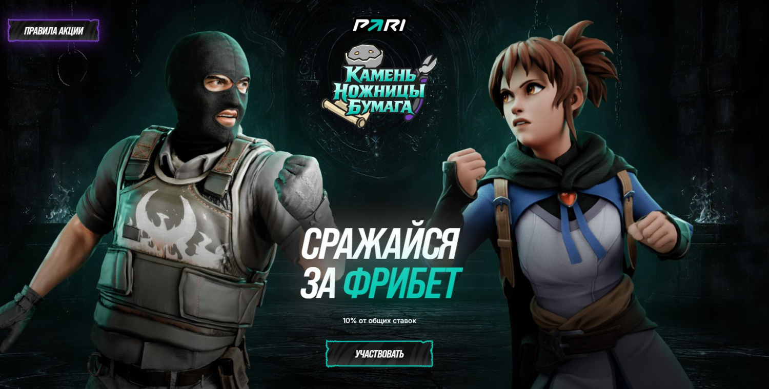 Букмекерская компания PARI проводит акцию «Камень, ножницы, бумага» для любителей киберспорта, объединяющую классические ставки и игровой элемент. Участникам предлагается заключать пари на турниры IEM Rio 2026 и PGL Wallachia Season 8, после чего — вступать в мини-игру «Камень, ножницы, бумага» за право получить фрибет. Размер бонуса напрямую зависит от активности игрока и может достигать 5000 рублей.