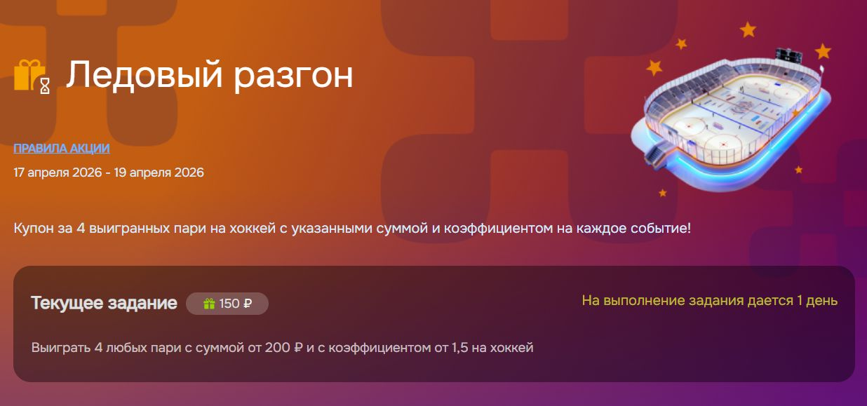 - Выиграть четыре ставки на хоккей в течение одного дня с момента активации участия (или до конца акции) с указанными в задании коэффициентами и суммами.