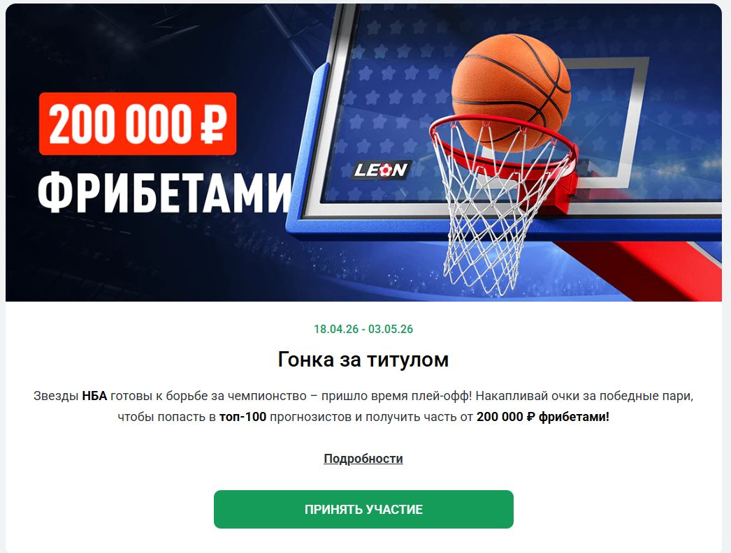 Букмекерская компания «Леон» проводит акцию к плей-офф НБА, в рамках которой участники могут побороться за часть призового фонда в размере 200 000 рублей. Механика проста: оформляйте ставки на матчи лиги, набирайте баллы за выигрышные пари и поднимайтесь в турнирной таблице. По итогам акции 100 лучших игроков получат фрибеты различного номинала.
