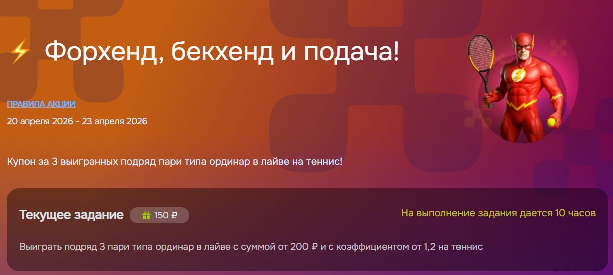 - В течение 10 часов после активации выполнить персональное задание – выиграть три одиночных live-ставки подряд на теннис согласно указанным условиям.