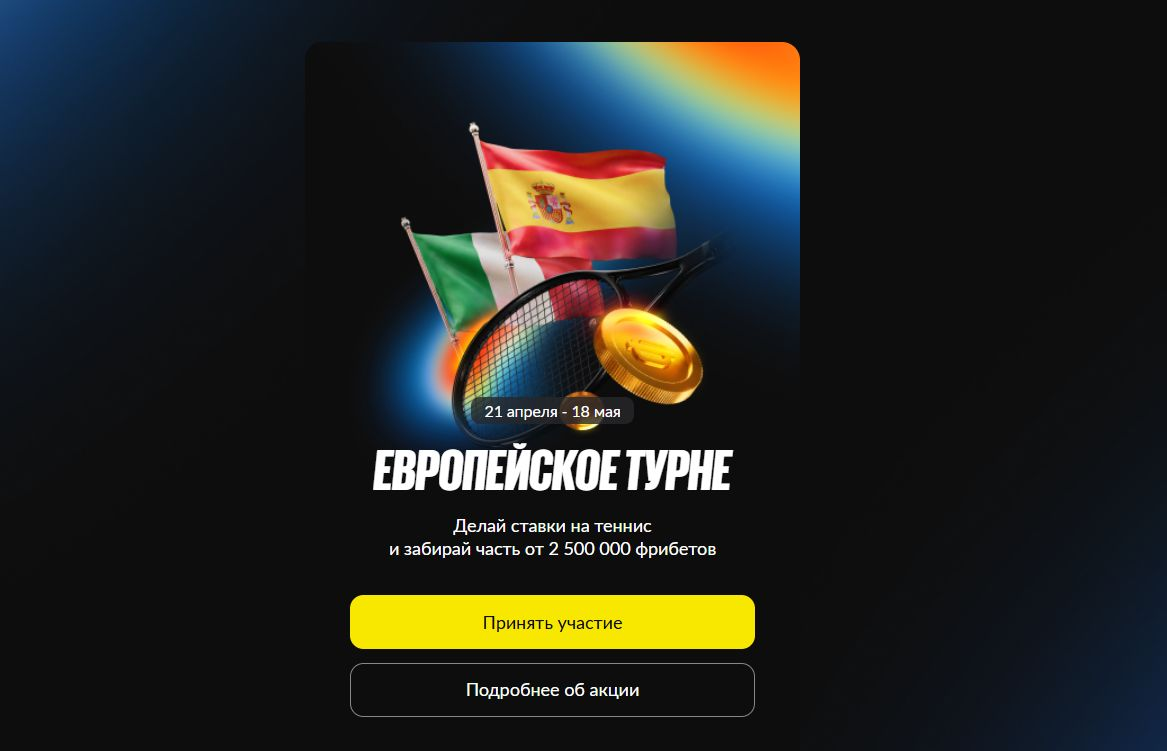 Букмекер BetBoom проводит акцию для поклонников тенниса с призовым фондом 2 500 000 рублей. В рамках «Европейского турне» участникам предстоит делать ставки на теннисные матчи и набирать баллы, чтобы занять место в топ-100 турнирной таблицы. Чем выше позиция в рейтинге — тем крупнее фрибет, который получит игрок по итогам акции.