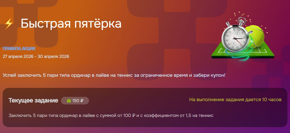 - В течение 10 часов после активации выполнить персональное задание – заключить пять одиночных live-ставок на теннис согласно указанным условиям.
