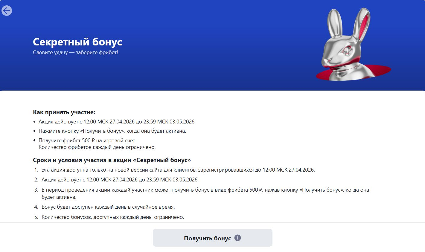 Пример. Игрок зашел в личный кабинет утром — бонуса нет. Днем он снова проверил страницу акции и увидел активную кнопку. После нажатия ему начислили фрибет 500 рублей. Если бы он пропустил этот момент, бонус за текущие сутки был бы упущен.