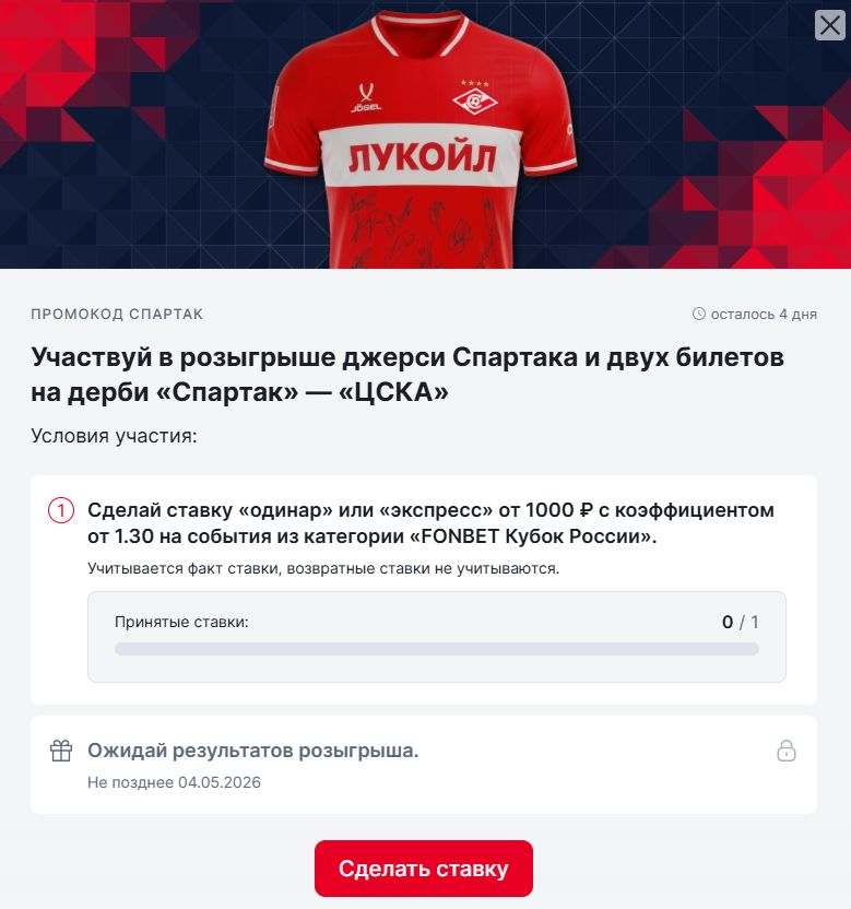 БК «Фонбет» проводит акцию к одному из самых ожидаемых матчей сезона — финалу Кубка России пути регионов между «Спартаком» и ЦСКА. Участникам предлагается не просто сделать ставку, а побороться за эксклюзивные призы: билеты на игру и фирменные джерси с автографами игроков. Механика проста — активируй промокод, оформи пари и попади в список претендентов на главный футбольный уикенд.
