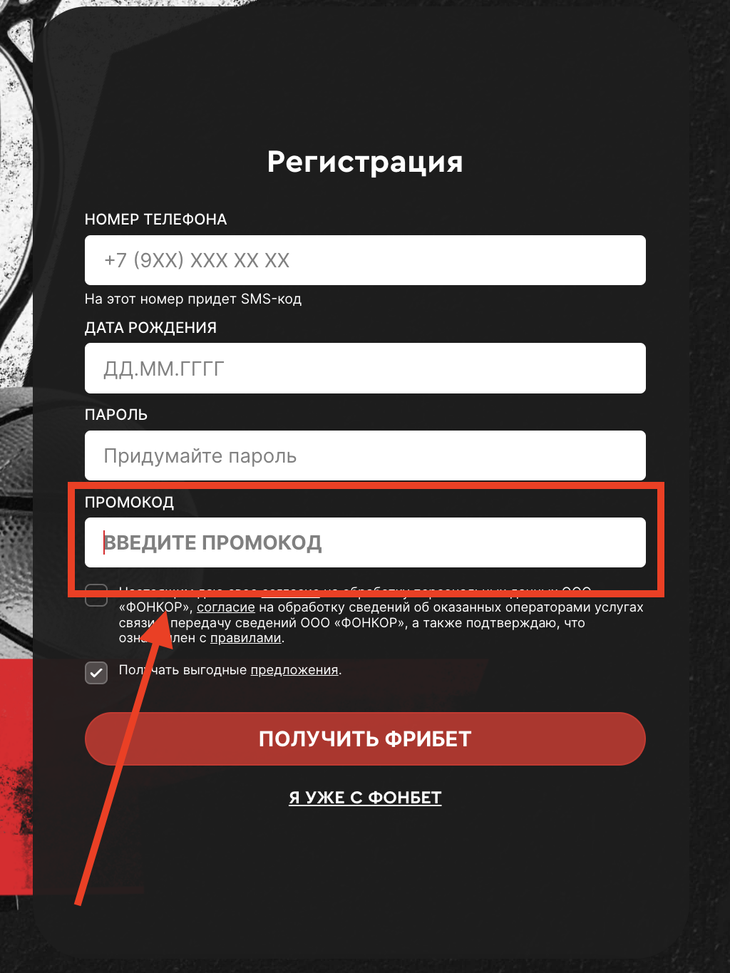 Новым игрокам в «Фонбет» промокод нужно указать в форме регистрации. Для этого в конце формы нужно нажать на ссылку «У меня есть промокод» и в появившемся поле ввести промокод.